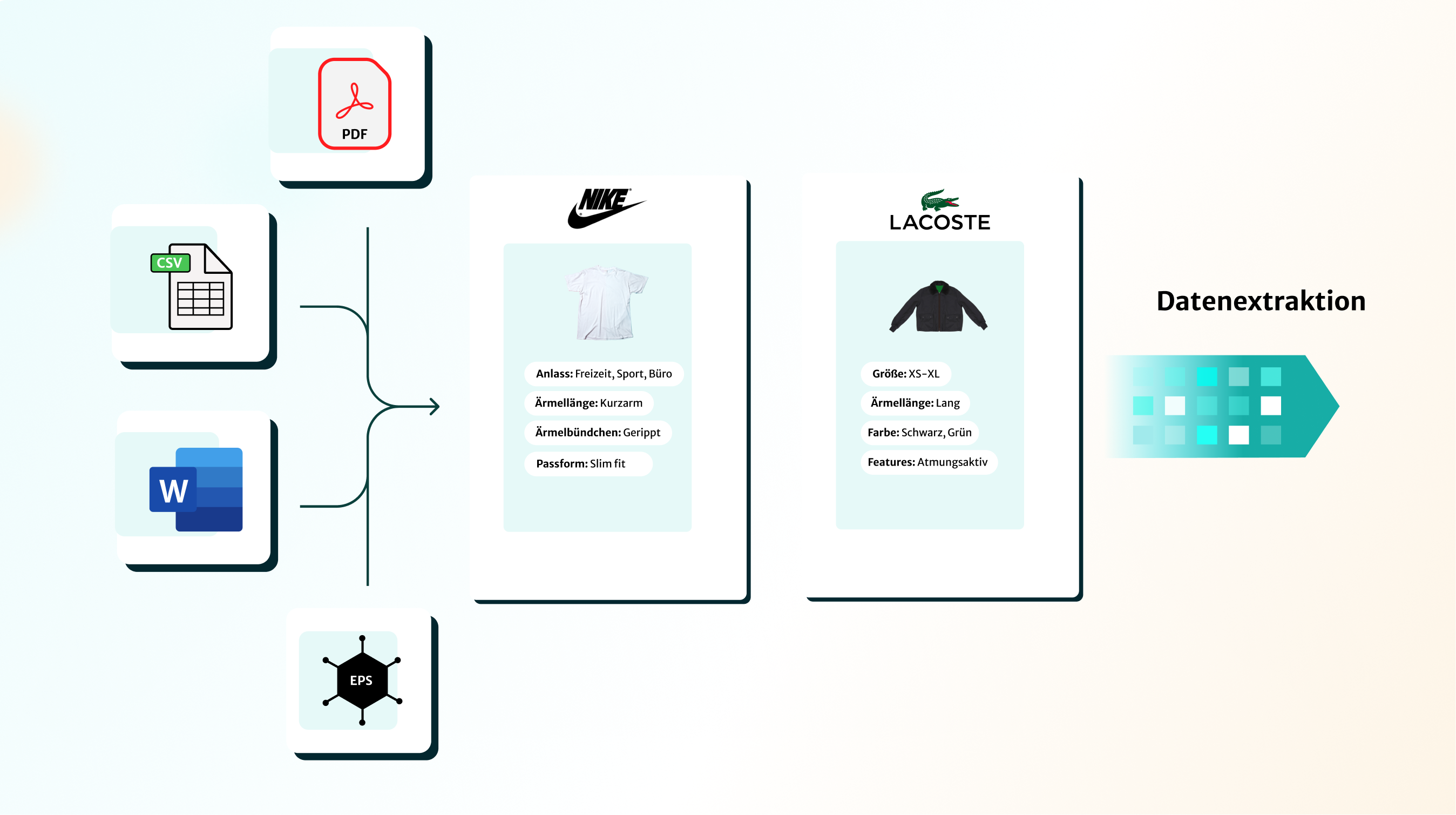 Unsere KI verarbeitet Produktdaten aus PDFs, CSVs und weiteren Formaten – auch von verschiedenen Anbietern.
